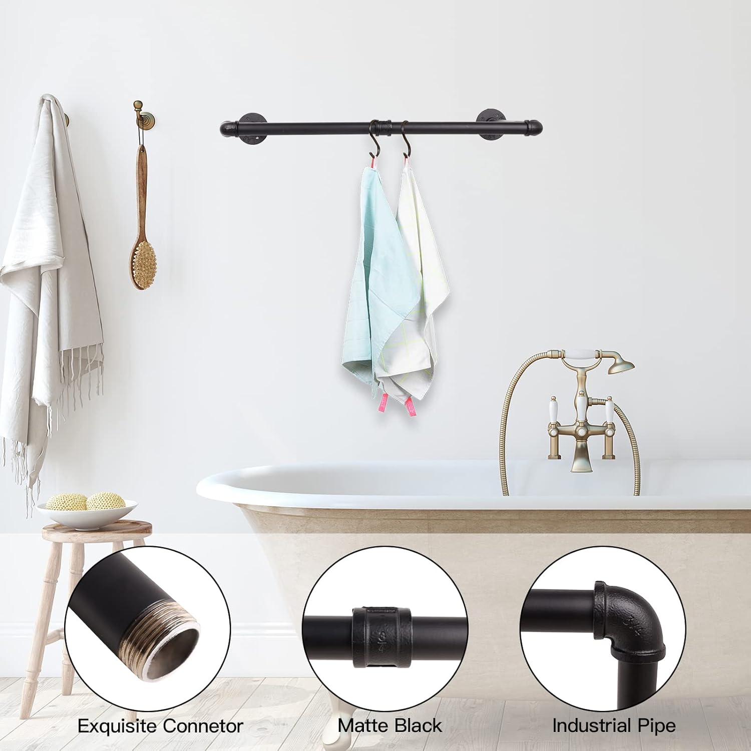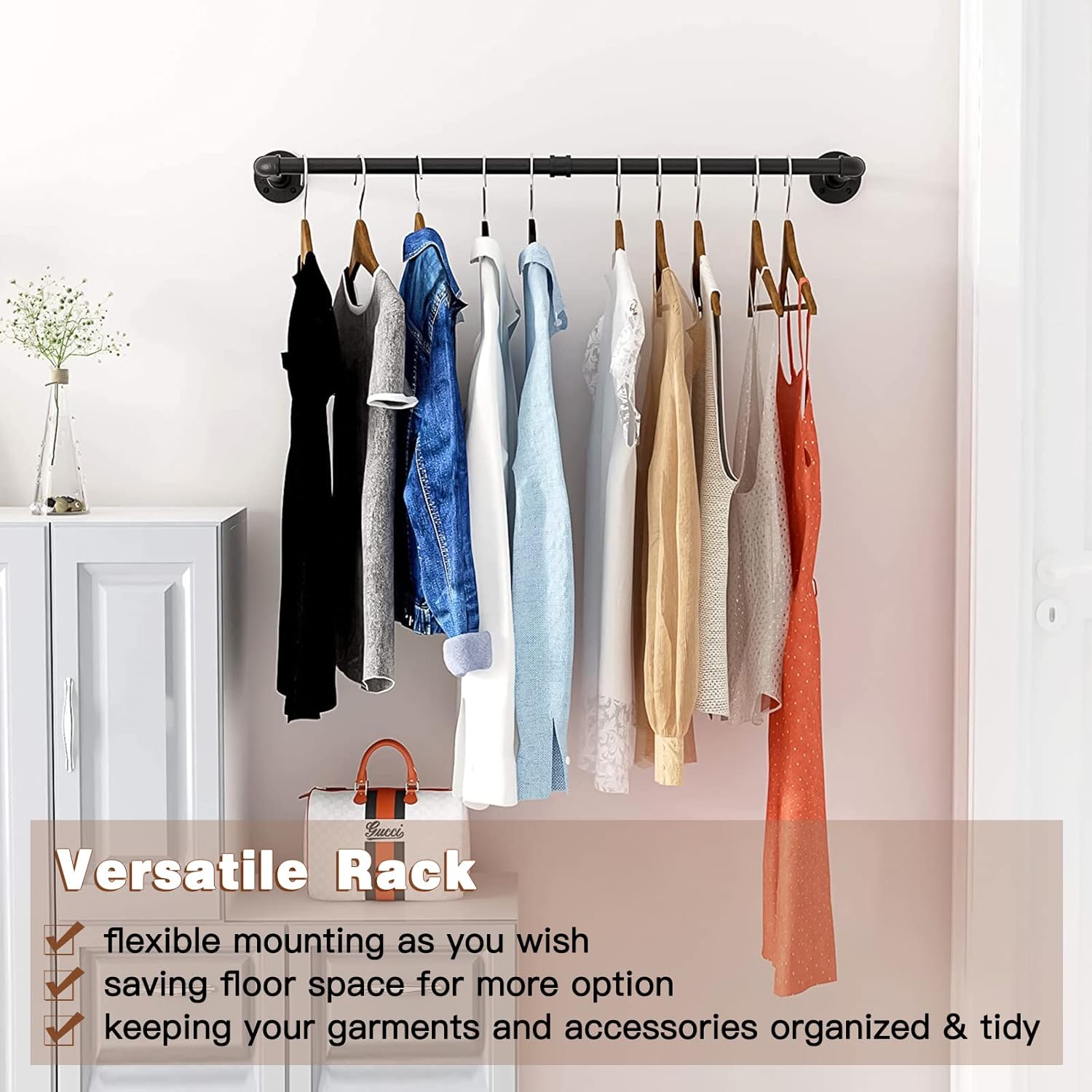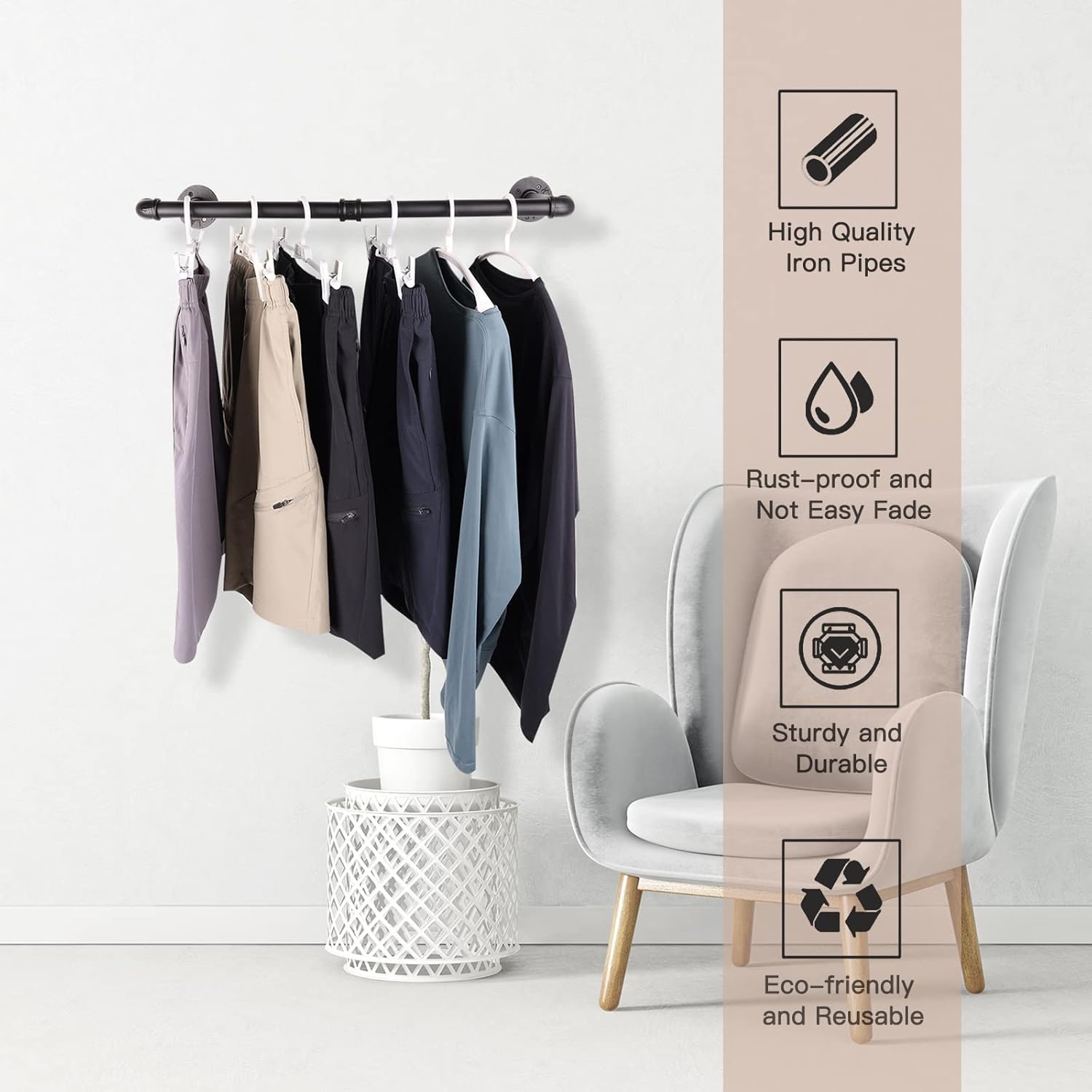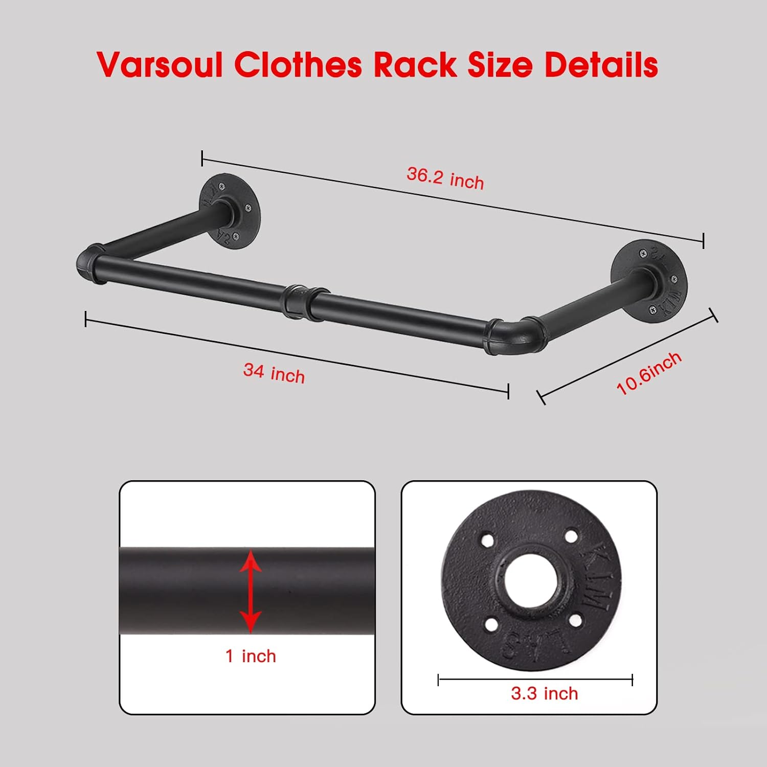 <h3> Pipe Clothes Rack with Realistic Pipes and Fittings </h3> <p> </p>The distance from the wall to rod is about 10.6 ", which prevents the cloth rail from contacting the wall. Easy to hang your clothes on and take them off.Easy to assemble, all hardware required is included. Just make sure to screw them tight, then mount it to the wall in minutes.